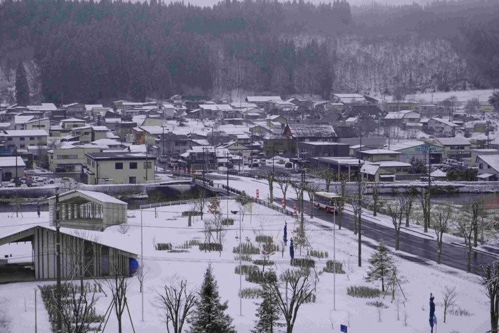 雪の鹿角市内を走る秋北バス(TS)